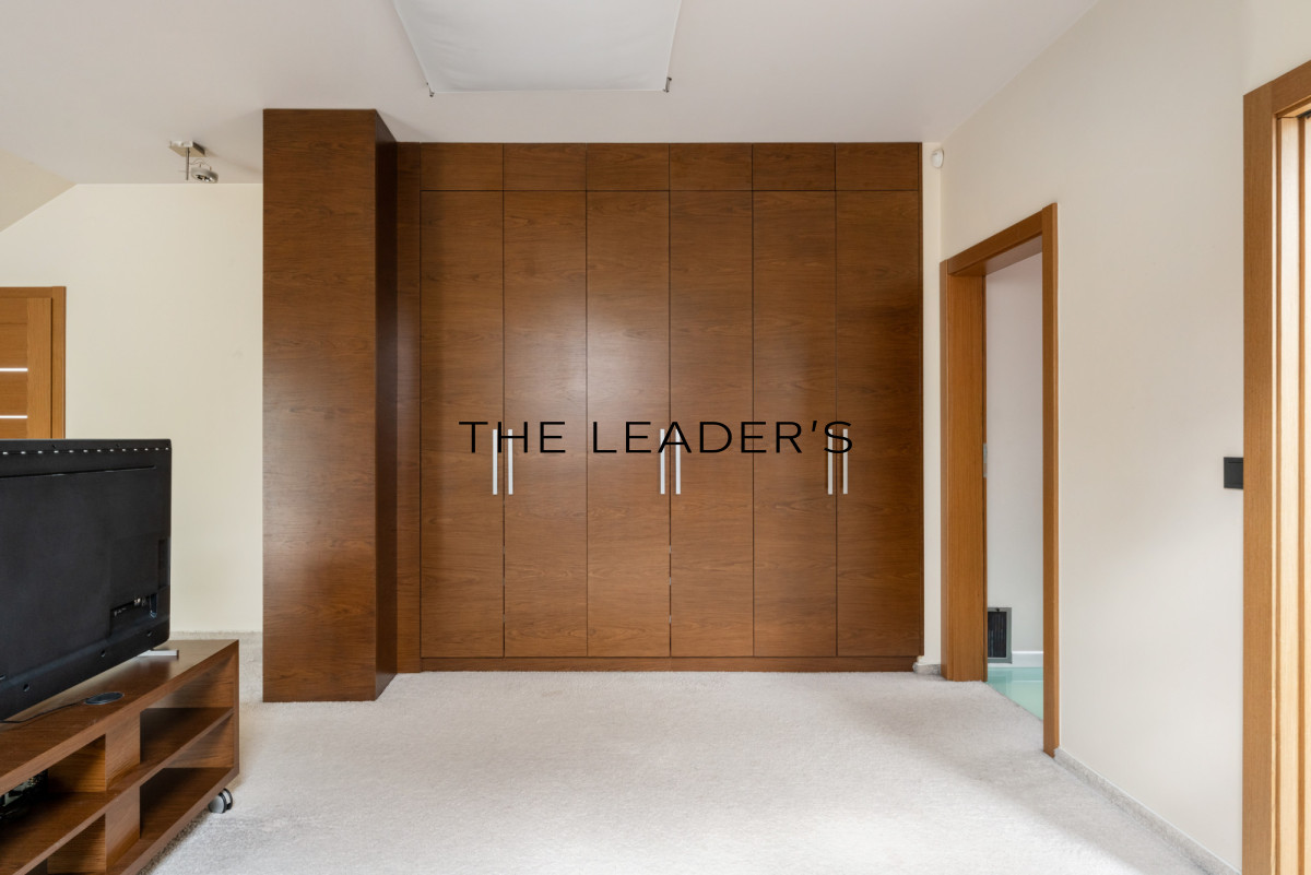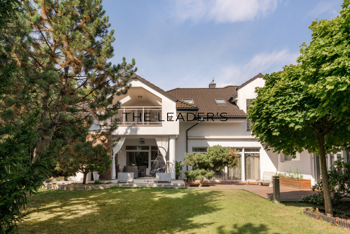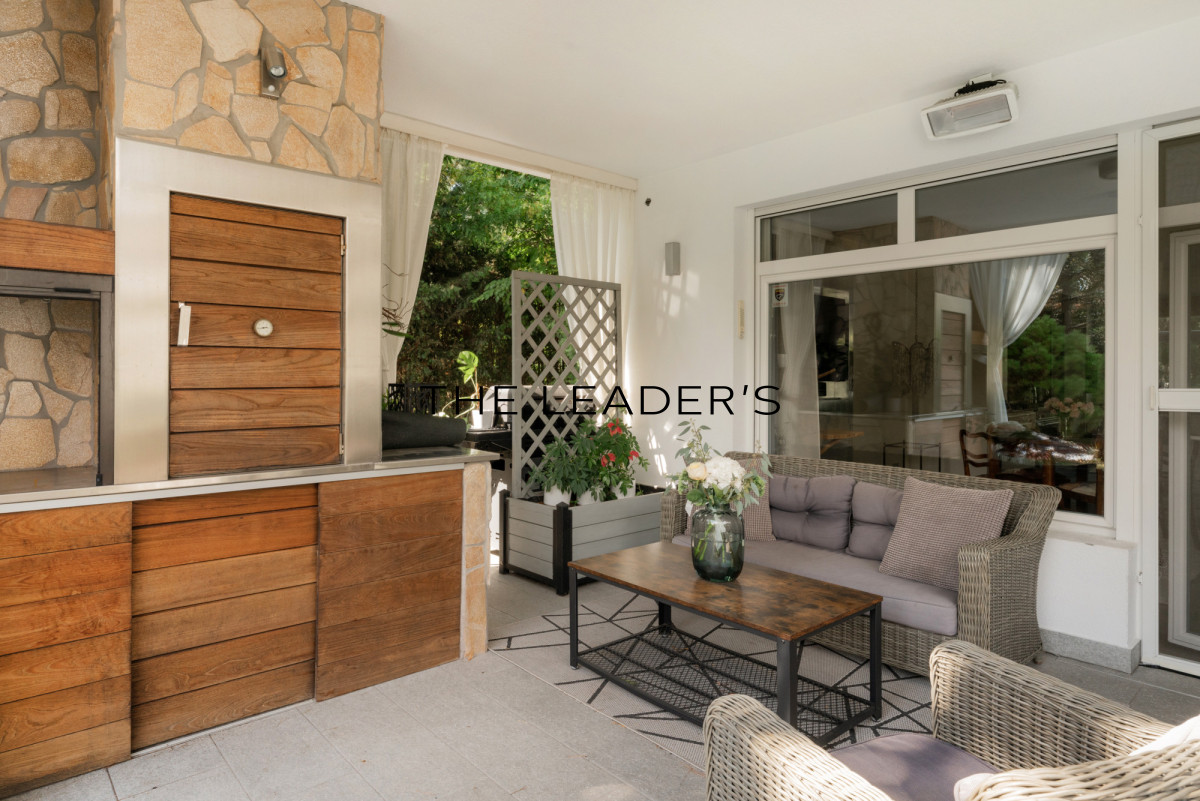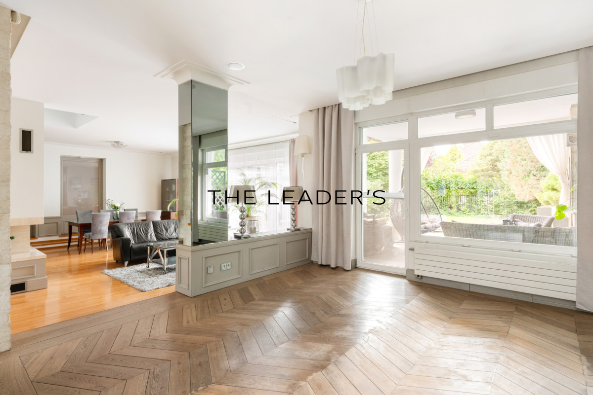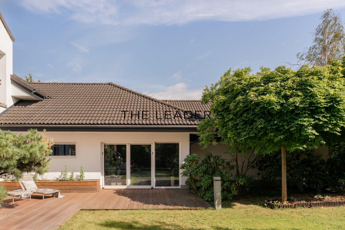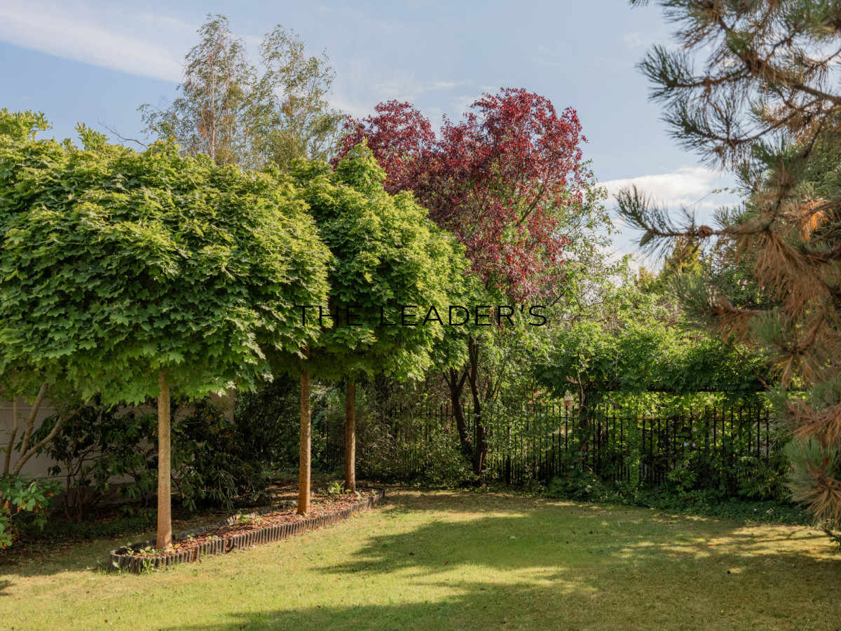 The residence sits on a 1,500 m² plot. The garden has been carefully designed with tall trees, shrubs, ornamental flower beds, and a granite driveway, creating an elegant and harmonious whole. As much as 75 meters of the property border adjoins a municipal recreational area, ensuring no development on that side and guaranteeing privacy. The neighborhood is a quiet, green area with villa developments, ideal for those seeking peace and comfort.