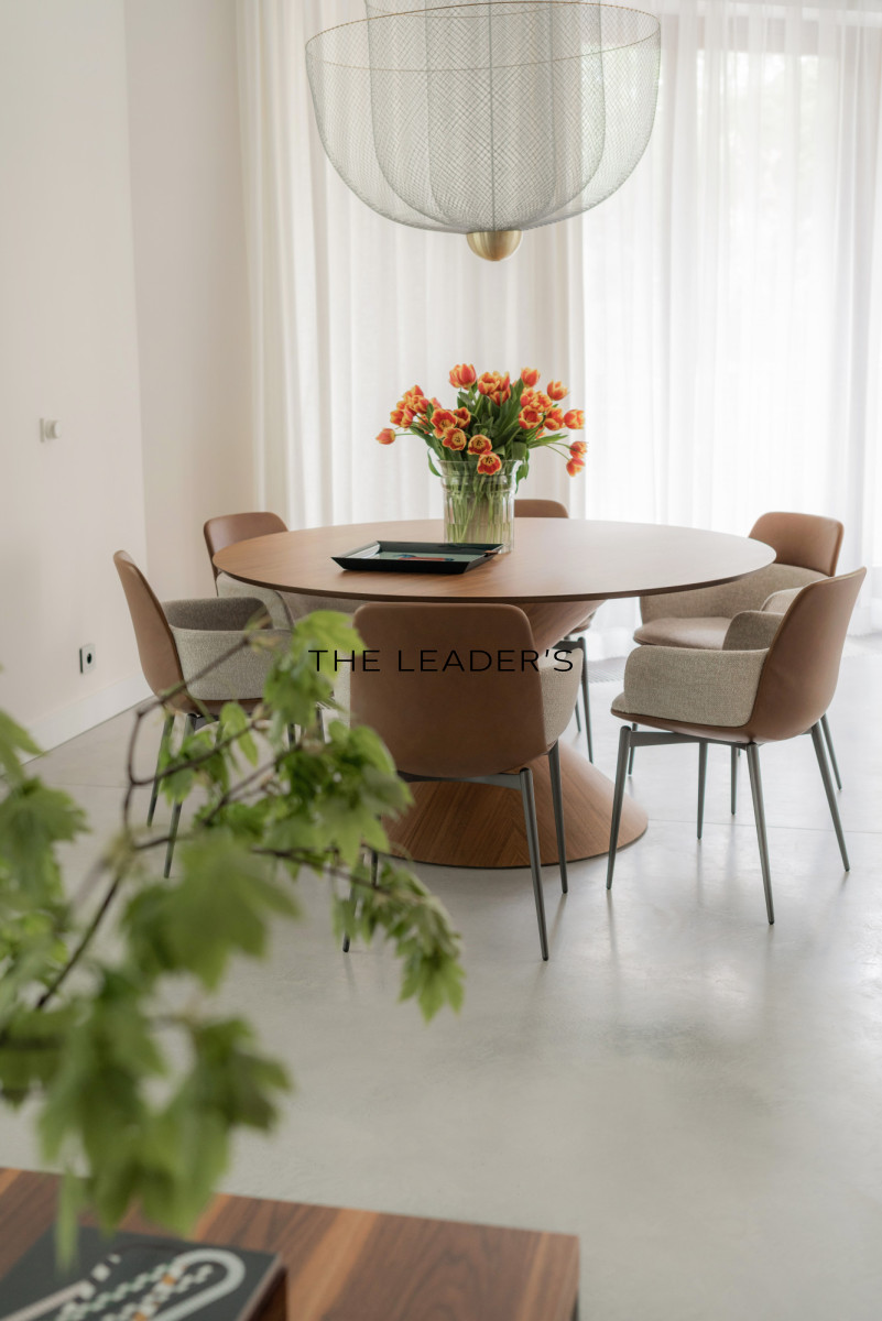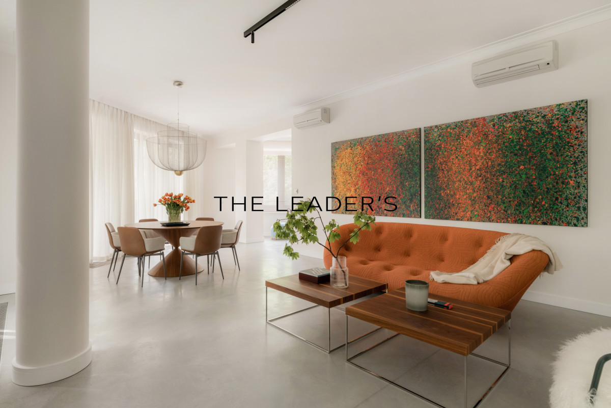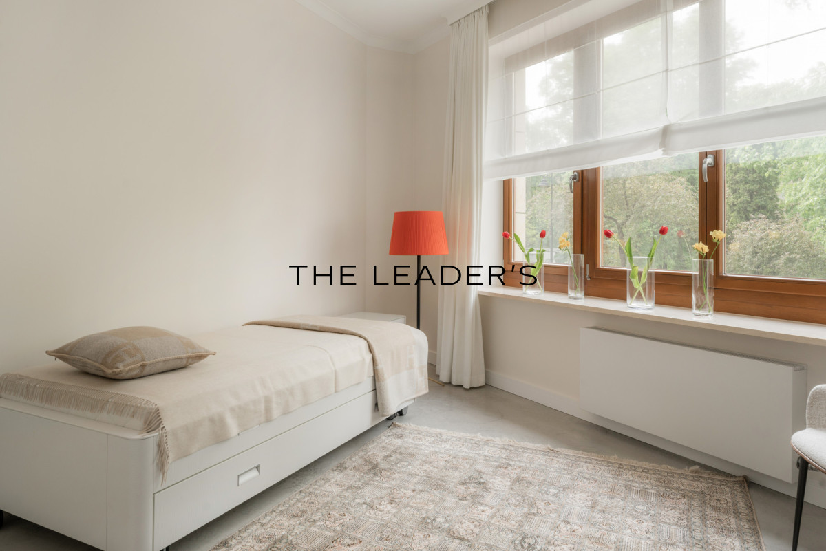 The 155 sqm apartment is located on the second floor of a seven-story building. It consists of a spacious and open living room to dining area, kitchen, master bedroom with private bathroom and dressing room, additional bedroom, bathroom, laundry room and utility room. The living room opens onto a loggia with a beautiful view of greenery. The entire apartment has been cohesively designed in a bright and minimalist style using top-class materials. An unquestionable advantage of the presented apartment is the view of the centuries-old trees of Saxon Park from all windows.