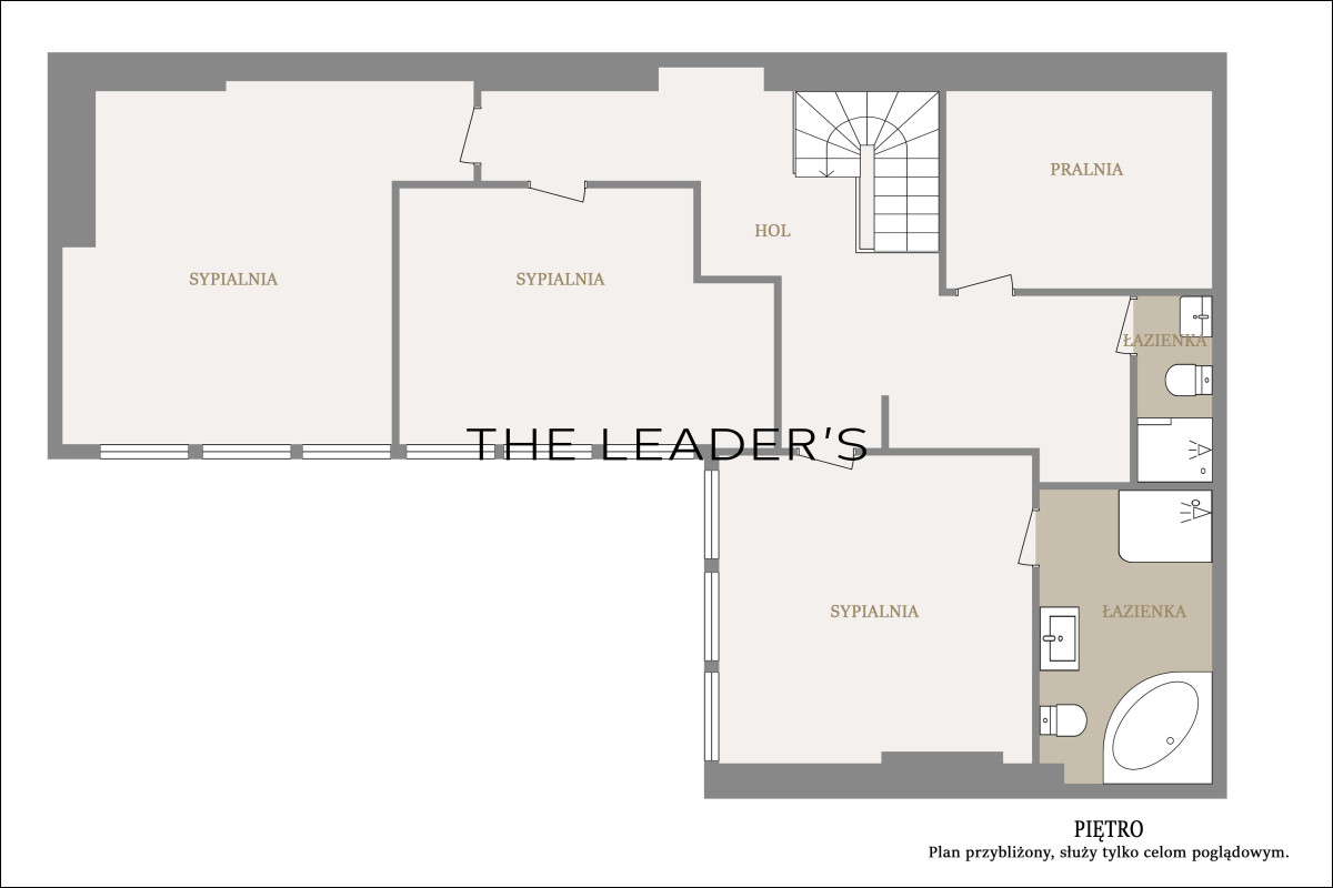 drugi poziom: trzech sypialni w tym jedna główna z łazienką, drugiej łazienki, pomieszczenia gospodarczego/pralni/garderoby, holu. Wysokość w pomieszczeniach waha się od 3,4 do 5 m.