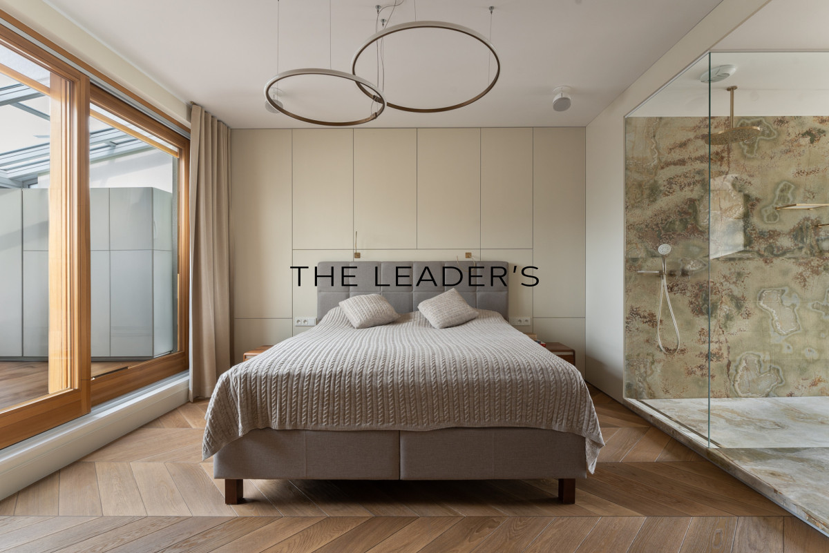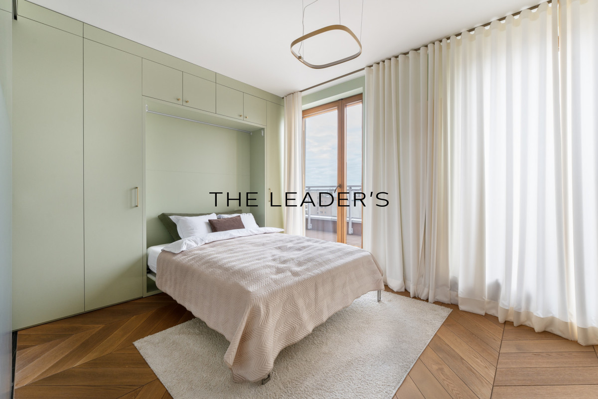 Eleganckie meble oraz dbałość o szczegóły wykończenia zapewniają wygodę i komfort, a spójna kolorystyka i możliwość sterowania natężeniem oświetlenia tej części mieszkania, sprzyjają atmosferze wyciszenia i relaksu. Panoramiczne, duże okna drewniane w systemie przesuwnym HS oraz ekspozycja na trzy strony świata: wschód południe i zachód czynią wnętrze bardzo jasnym i dobrze doświetlonym.
