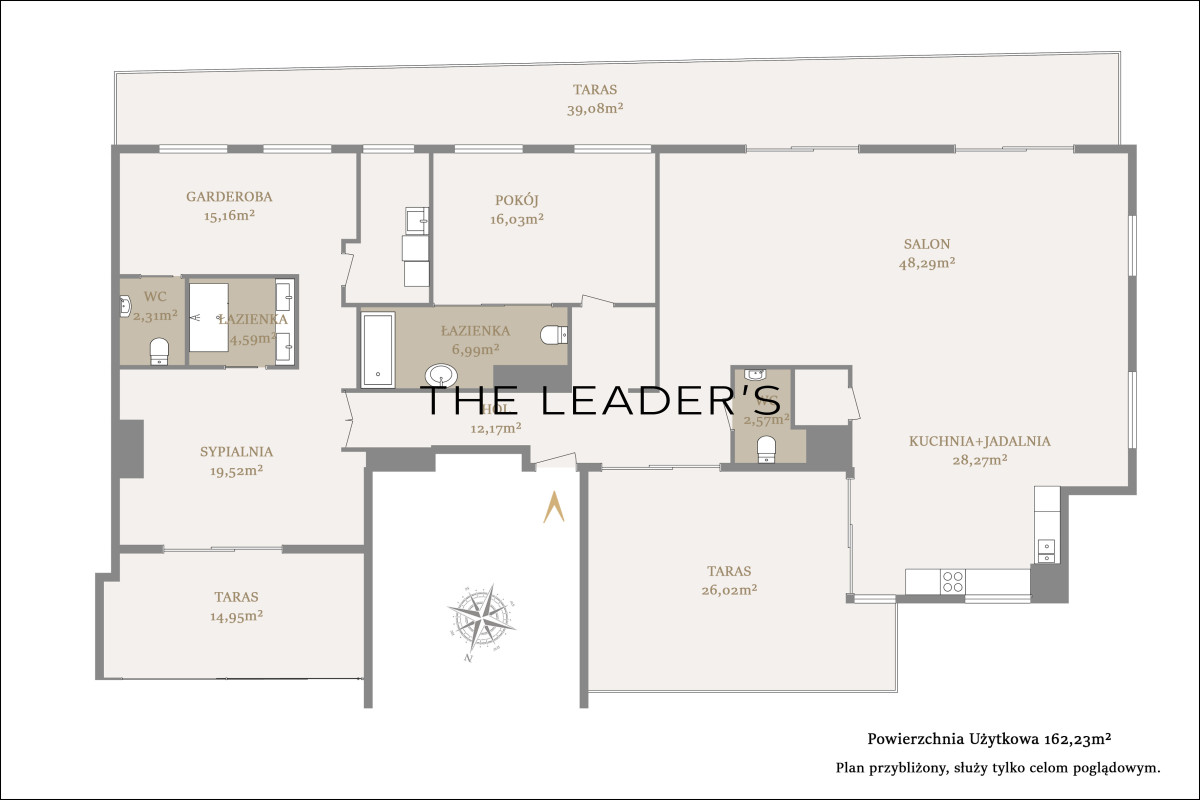 Penthouse, składający się z przestronnego, dużego salonu, kuchni otwartej na salon, spiżarni, dwóch ustawnych sypialni każda z własną łazienką, garderoby, pomieszczenia gospodarczego/pralni, dwóch toalet.