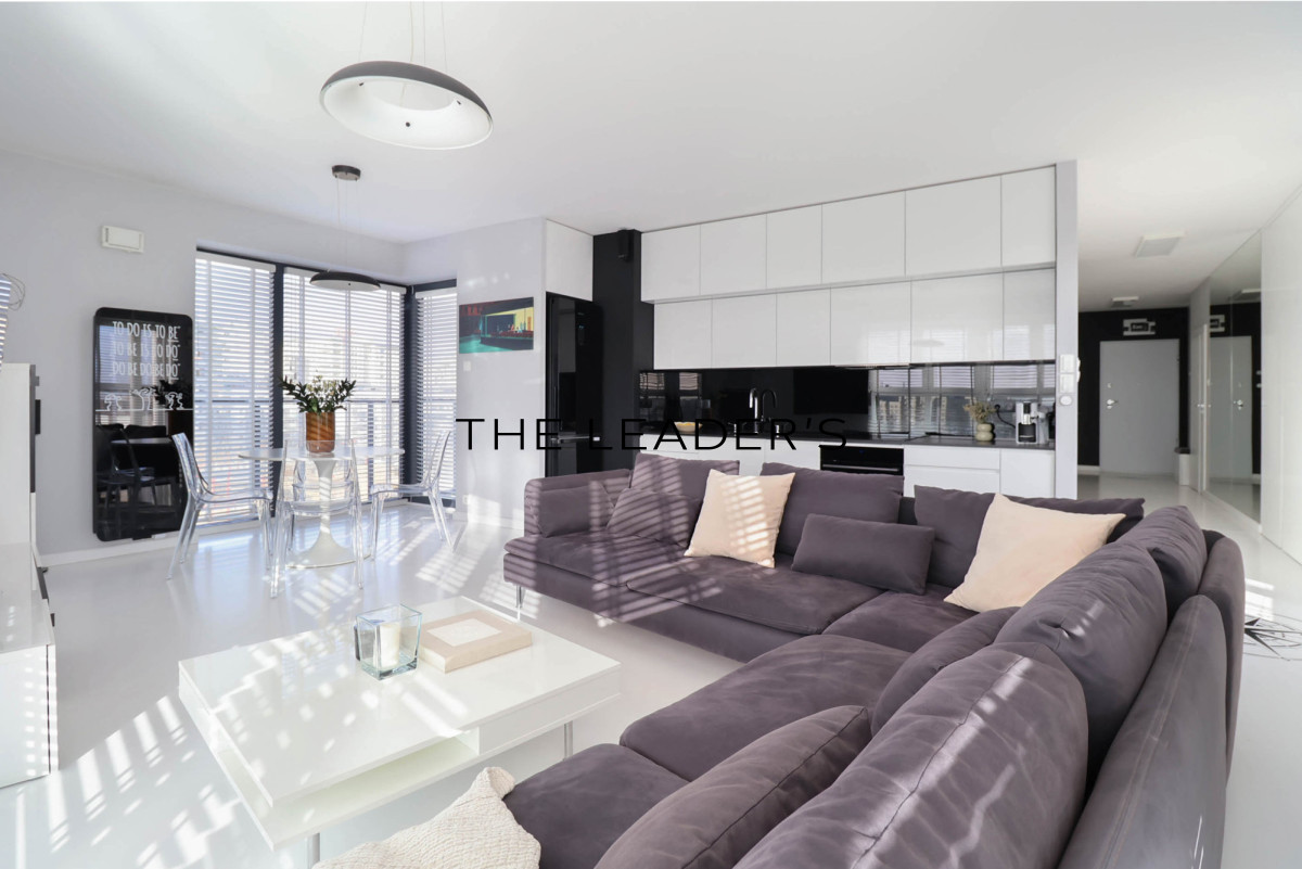 The apartment has windows on three sides, so it is very well lit. The living area includes a living room with a dining room and a kitchenette. The living room has a 5.1 Harman Kardon home theater system with an active subwoofer with a Blue Ray player and AirPlay/Bluetooth. The living area is extended by a 60 sqm terrace with a panoramic view of southern Warsaw. A huge advantage of the property is a terrace with a lounge set for 6 people, an automatic watering system and a remotely marquis protecting from the sun with automatic folding during high winds. Additionally, in summer it is possible to place a 4-person jacuzzi (there is access to water on the terrace).