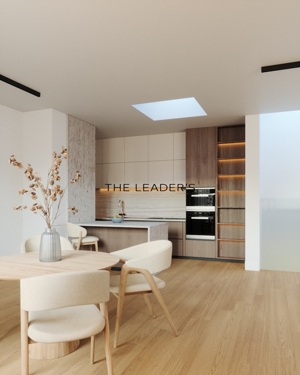 This is a duplex 3-bedroom apartment with an area of 100.18 m², located on the 3rd floor of a modern low-rise apartment building. The apartment consists of a spacious living room with a kitchenette, three bedrooms, two bathrooms, and a communication area.