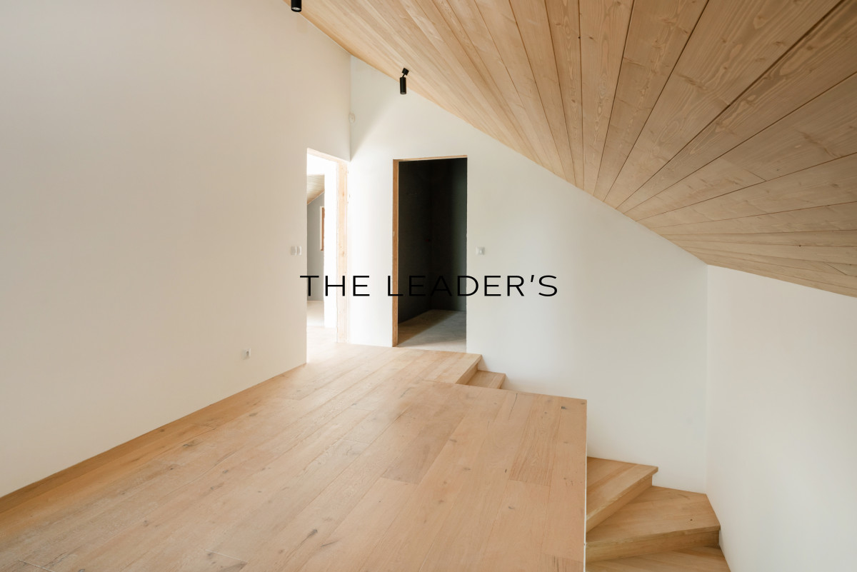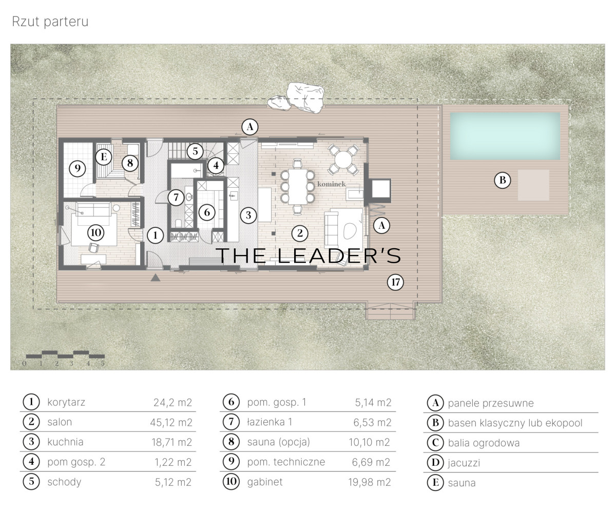 „Kanstania” in the Masurian dialect means horse chestnut, from which the name of the presented house is taken. After opening the door and crossing the threshold, we are in an entrance corridor equipped with a wardrobe, from where we can go to the living room which consists of a two-storey high lounge area which is well lit by large windows and an open kitchen.. Further on, there is a bathroom, sauna, study room and utility rooms (technical and utility). Taking the stairs to the first floor, we find a corridor, a master bedroom with a bathroom, two guest bedrooms and a second bathroom.