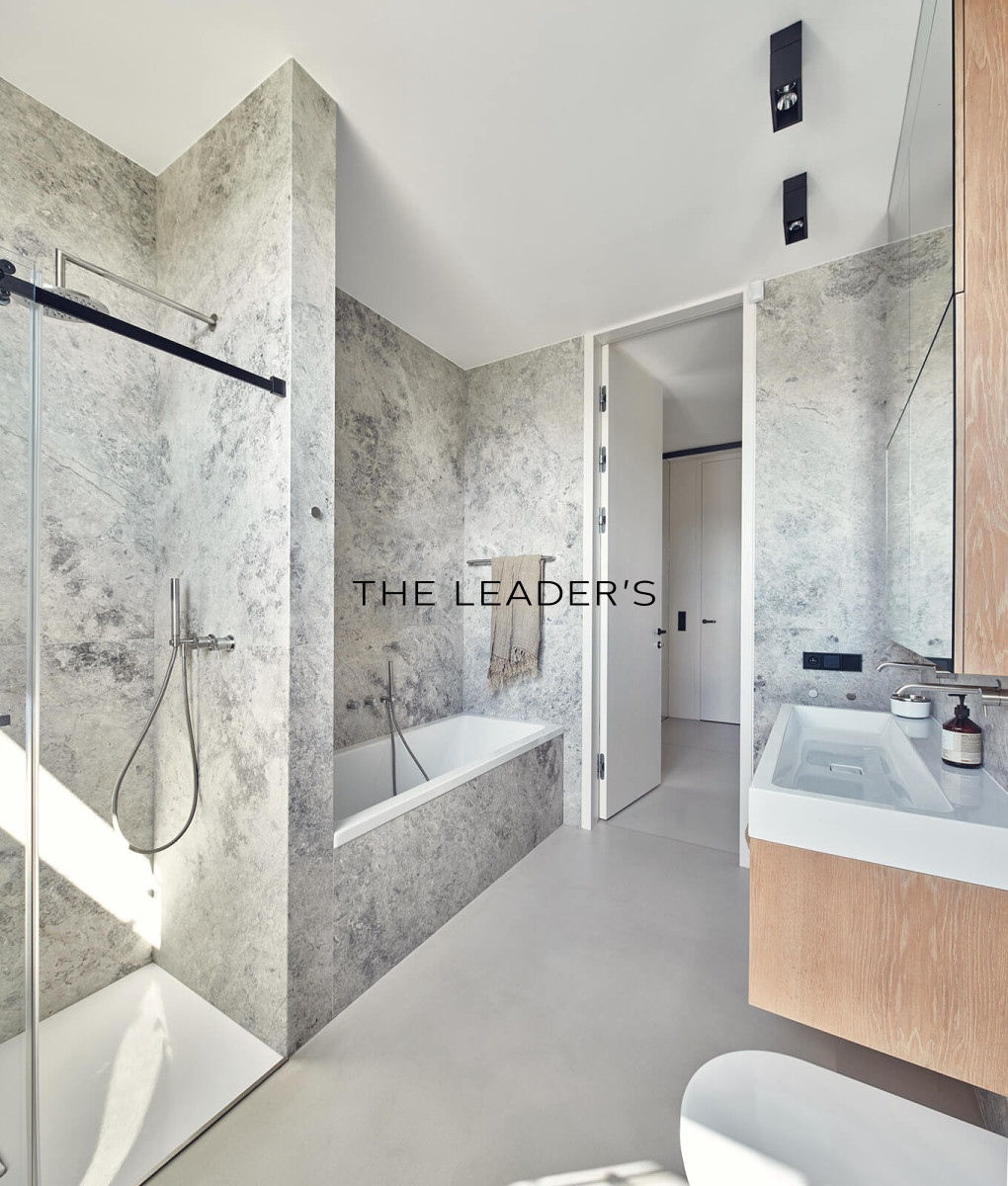 The bathrooms, finished in noble stone, combine modernity with cozy elegance, and the living area, which opens onto a terrace and balconies, offers an impressive